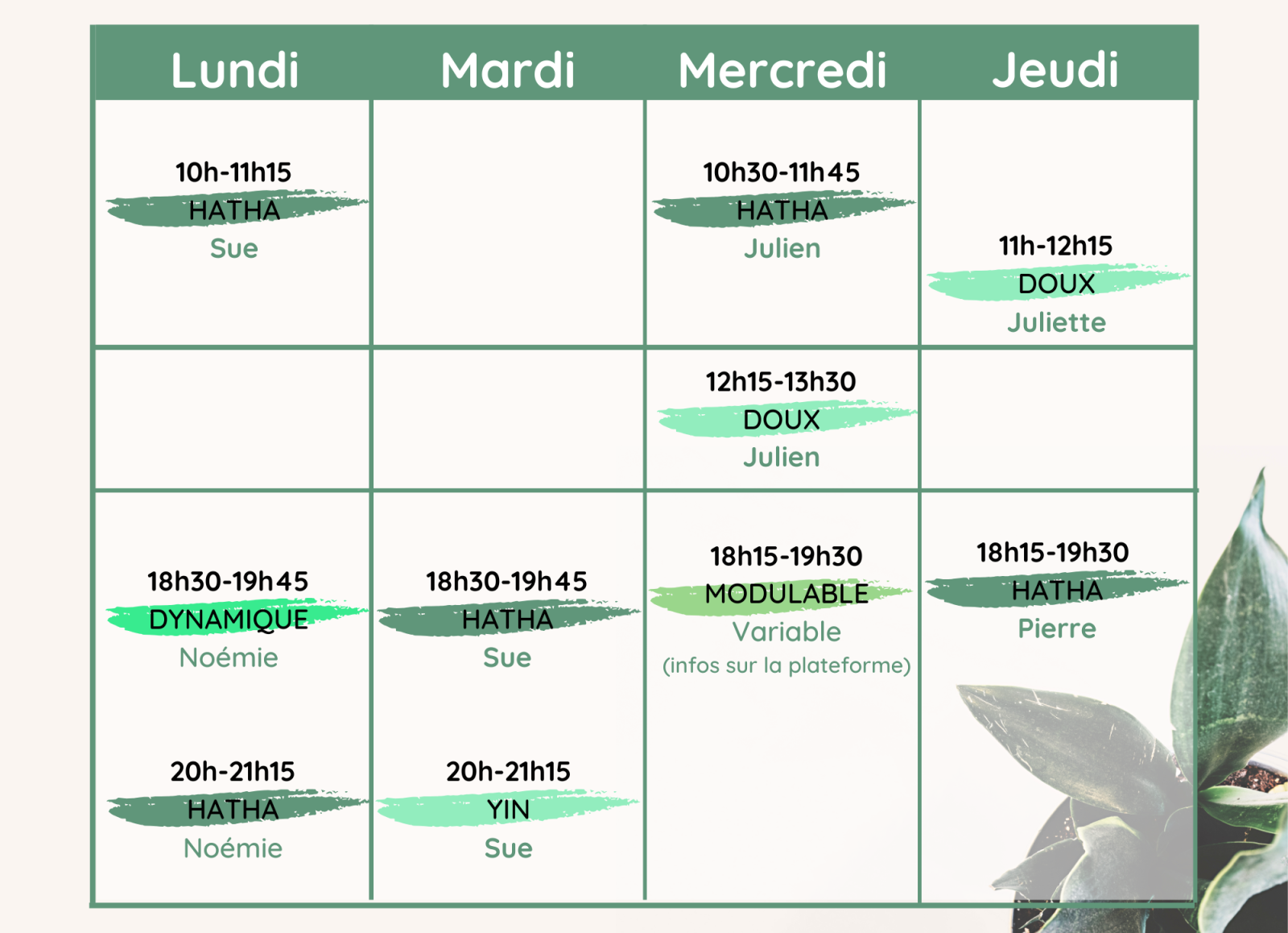 Toutes les propostions spéciales (chant, méditation, yoga postnatal, relaxations...) ici.